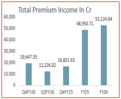 - Net premium for Q4FY26 stood at ₹19,180.08 crore, reflecting a strong increase of 62.4% QoQ and 17.2% YoY. On an annual basis, net premium reached ₹51,335.63 crore in FY26, up 8.6% compared to ₹47,259.41 crore in FY25.