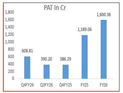 - Profitability remained strong, with PAT for Q4FY26 at ₹608.81 crore, up 56% QoQ from ₹390.2 crore and 57.6% YoY from ₹386.29 crore. For the full year, PAT stood at ₹1,600.36 crore, marking a robust growth of 34.6% YoY.
