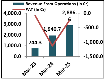 - It reported revenue from operations of ₹2,886.64 crore in FY25, reflecting a 48.74% increase from ₹1,940.71 crore in FY24, and incurred a loss of ₹243.26 crore in FY25. In Q1FY26, it reported revenue from operations of ₹847.09 crore and a loss of ₹127.01 crore.